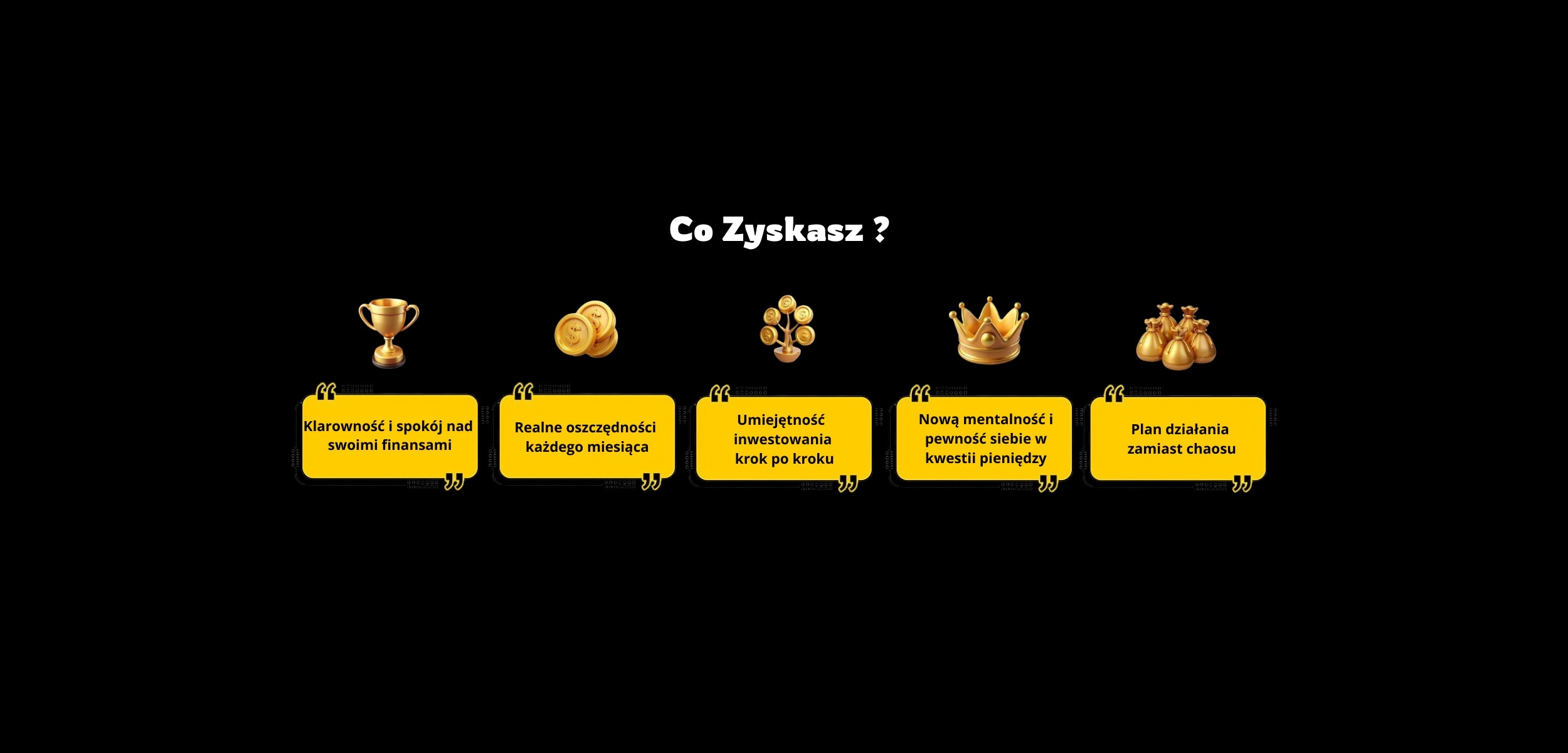Zyskasz praktyczne narzędzia do kontroli finansów i nawyków, nauczysz się oszczędzać bez wyrzeczeń i dowiesz się, jak zbudować majątek oraz nawyki które z Tobą zostaną.